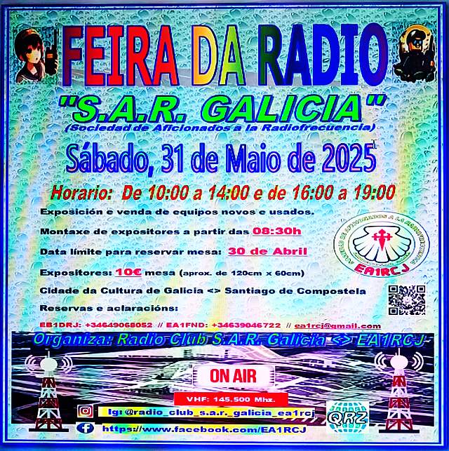 Los compañeros de SAR Galicia, organizan el Sábado 31 de Mayo una nueva Feria de Radio en Compostela. Enhorabuena por el esfuerzo organizativo y... ¡allí nos veremos el último Sábado de Mayo!