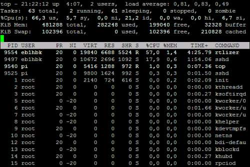 En este caso hemos ejecutado el analizador de espectro de modo remoto a traves de la red ethernet mediante ssh. Como el análisis espectral de la banda elegida de realiza en el propio Raspi, la carga sobre el sistema es mayor que cuando trabaja como servidor de datos para el SDR Sharp, necesitando en este caso un 57% de recursos: