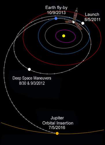 En estos momentos la sonda Juno se acerca a la tierra cada vez mas rápido, impulsada por el influjo gravitatorio de nuestro planeta.