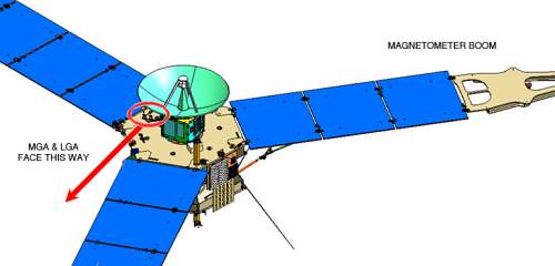 Actualmente Juno está usando su antena de baja ganacia (LGA), una bocina para microondas y 25 vatios de RF en 8,4 GHz. A pesar de que viene hacia nosotros a toda velocidad, la distancia es aún de unos 9 millones de kilómetros.