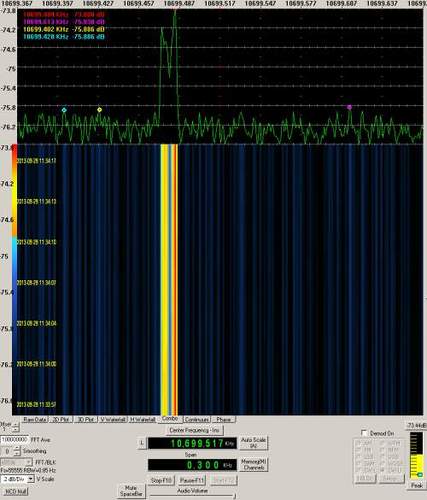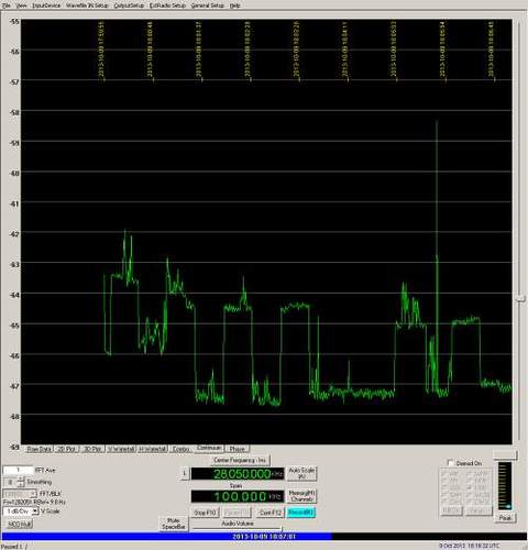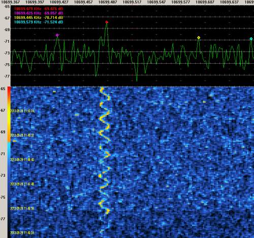 Para este evento hemos tenido la colaboración y participación de muchos compañeros, no solo radioaficionados, sino tambien del mundo de la Banda Ciudadana por ello , salvo la estación de HF en 40 mts de EA1HBX y los equipos de respaldo, la transmision de la secuencia HI en QRSS se realizó completamente con equipos de 27 MHz -transceptor y amplificador lineal de válvulas- adaptados a la banda de aficionados de 10 mts. En esta captura del espectro tomada por Iban -EB3FRN- podeis ver la secuencia de transmisión HI, tal y como debia ser visible por la sonda a lo ancho de su espectro de recepción: