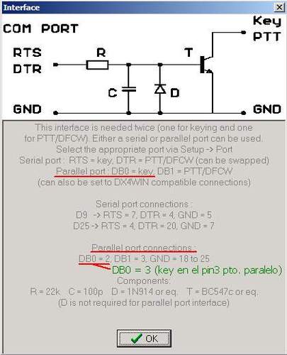 Por cierto, en nuestra versión hemos apreciado que la conexion del "key" (manipulador), en el puerto paralelo, no va al pin nº 2 como se indica. Debe ir al pin 3 del puerto paralelo. La correccion realizada se ha remarcado en verde sobre la imagen. Para comprobar el correcto funcionamiento del interface, el programa dispone de un menu para testear ambas salidas: key y PTT (nosotros solo usamos el  key, trabajaremos en QSK).