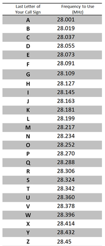 Por ejemplo, si tu distintivo termina en la letra L, deberías utilizar la frecuencia 28,199 MHz
