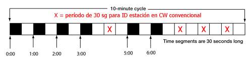 Nosotros casi con seguridad optaremos por realizar la identificación de la trasnmisión de CW a una velocidad mayor, enviando distintivo y locátor en el período de 30 segundos siguientes. Esto nos deja otro período completo de 90 segundos de pausa hasta completar el tiempo total de 10 minutos, antes de  comenzar de nuevo el ciclo de TX.