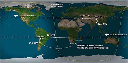 El próximo 9 de Octubre, Miércoles, a partir de las 19:21 UTC (las 21:29 hora local EA) la sonda espacial Juno pasará muy cerca de nuestro planeta en su viaje de exploración hacia Júpiter.