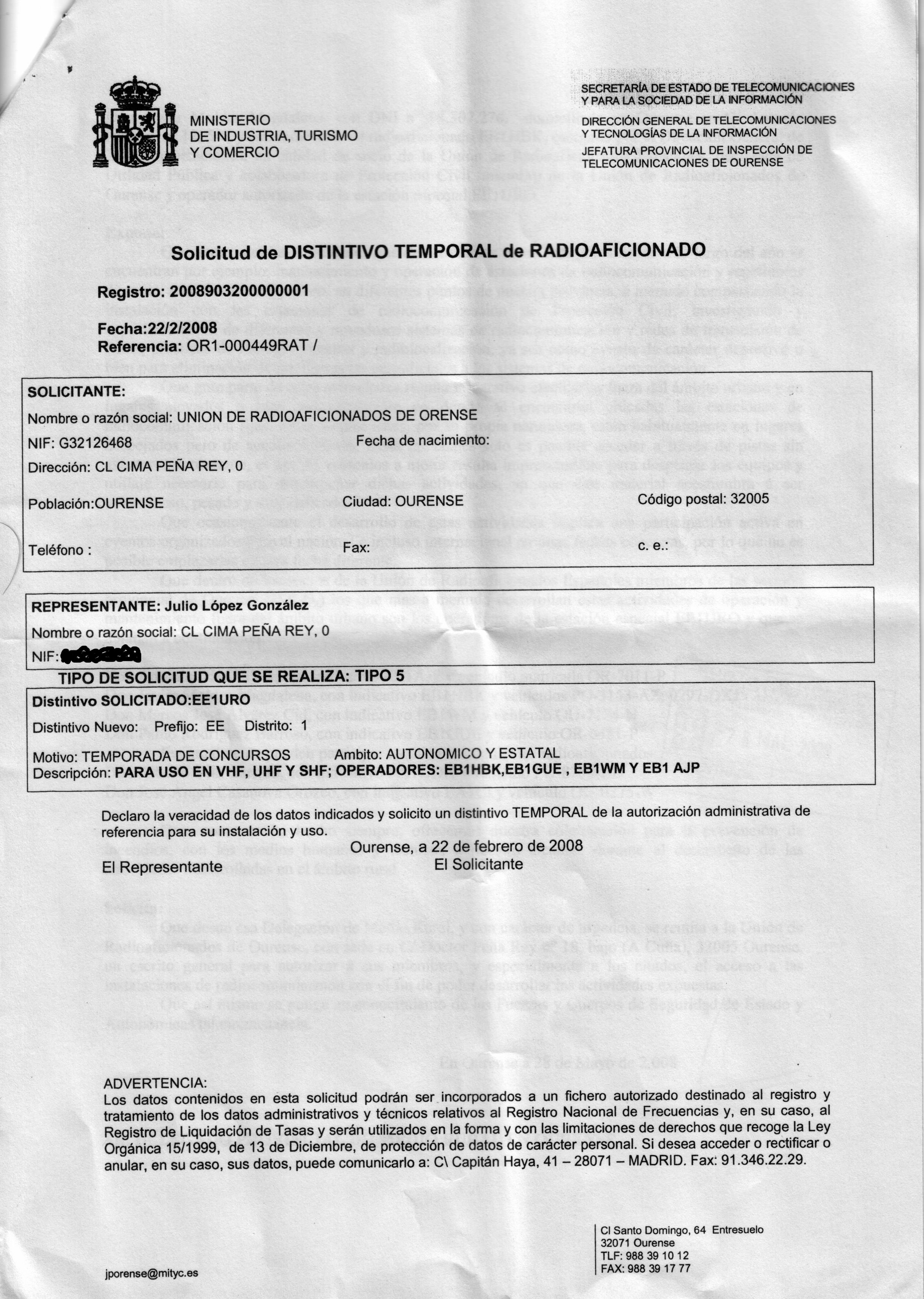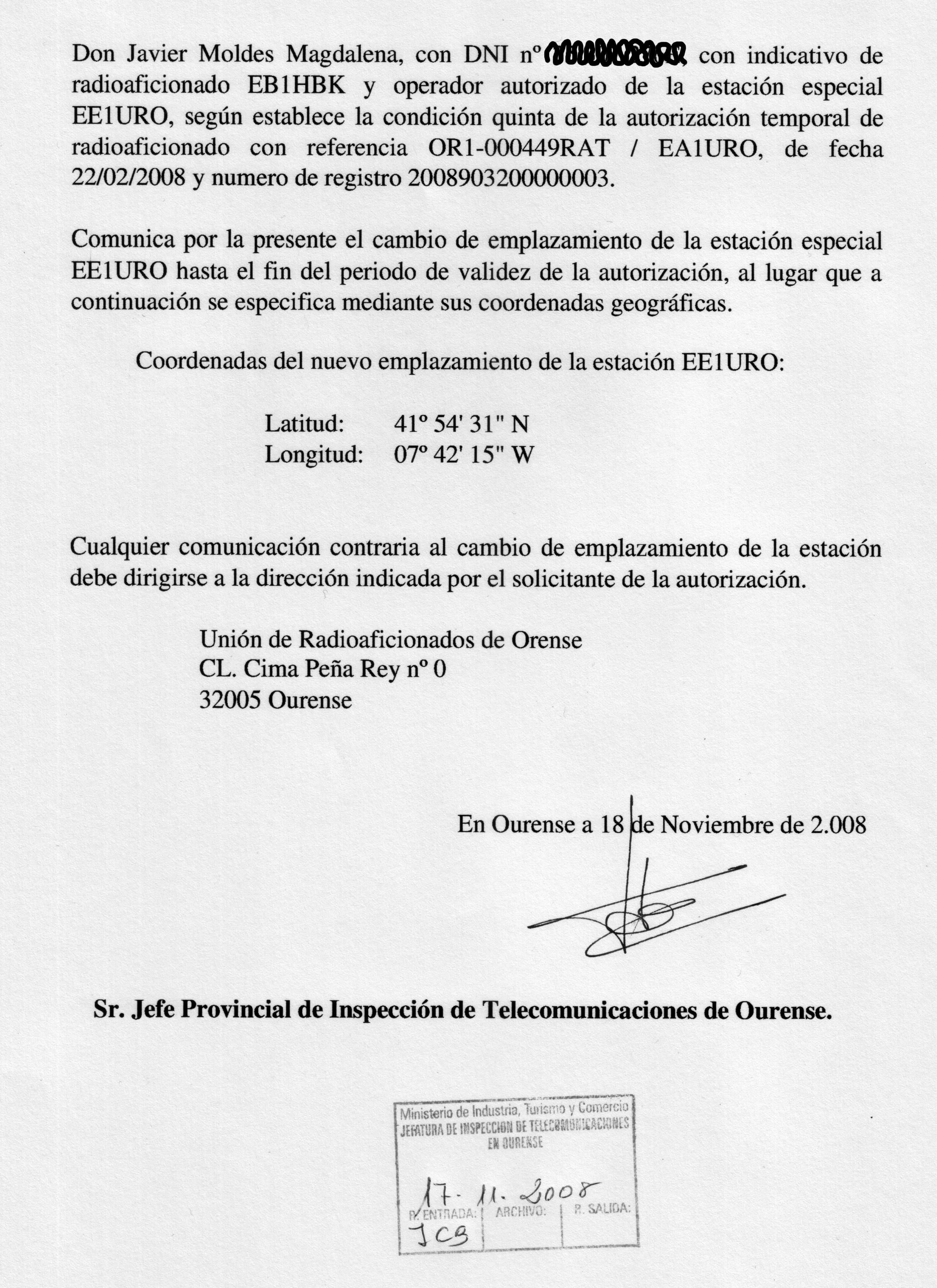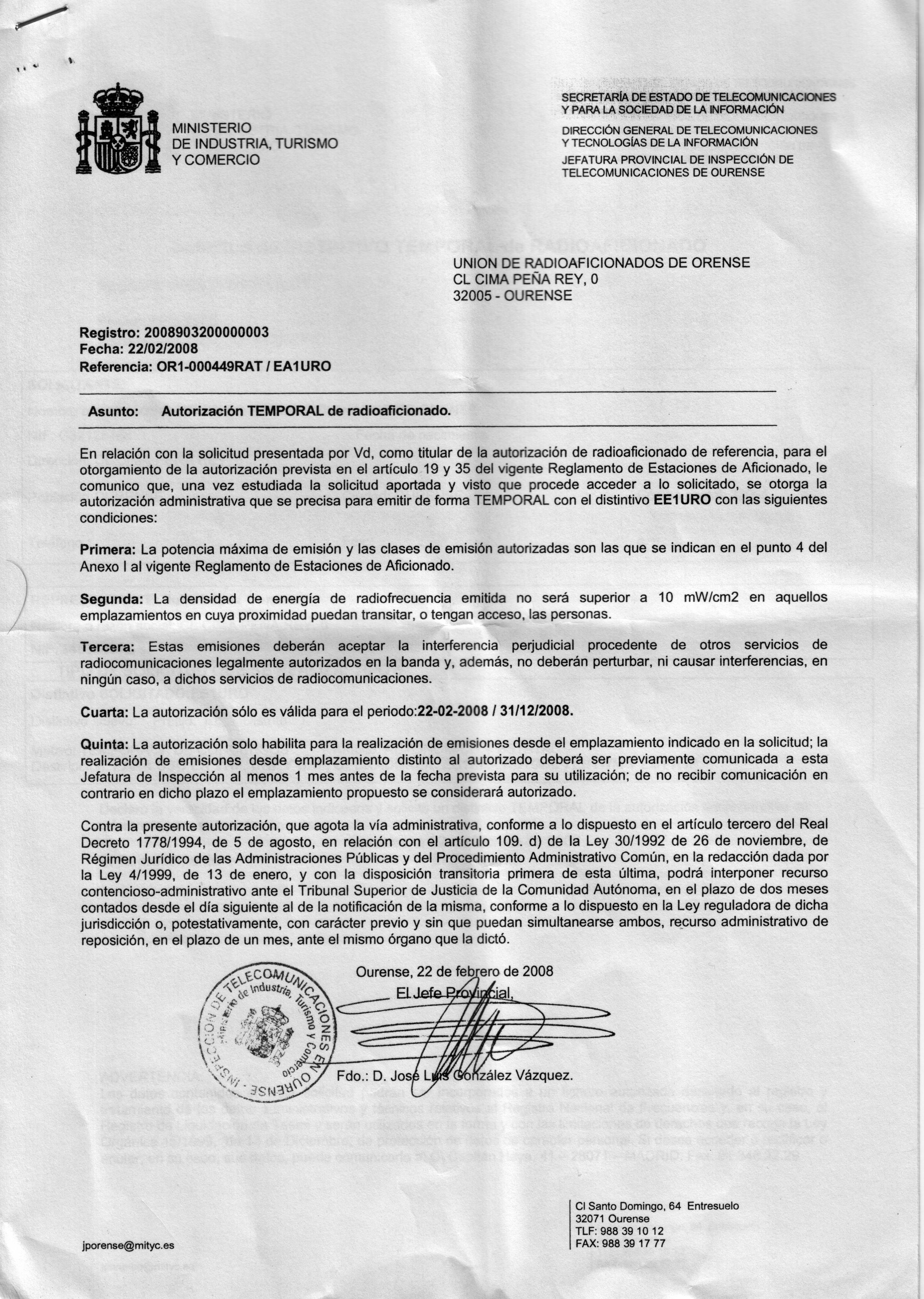 Para que non haxa suspicacias de ningún tipo, a continuación achegamos a documentación que nos habilita para levar a cabo esta actividade. Como podedes comprobar, solicitouse unha modificación da autorización temporal que nos permitiu operar toda a tempada de concursos nesta banda desde IN62GE. Como dicía unha canción (de 'No me pises que llevo chanclas'? ) ... Documentación, los papeles del camión. O dito, como a Autoridade competente non nos puxo ningún atranco [...]. A bo entendedor, poucas palabras bastan.