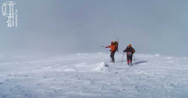 Recogimos el campamento con rapidez ante un posible empeoramiento del tiempo. con la luz del día la temperatura no era tan baja, pero el viento se había intesificado, ademas durante la noche había vuelto a nevar y eso iba a hacer mas difícil el camino de regreso. Casi todas la fotos son del regreso, la noche anterior las baterías de la cámara habían sucumbido al frío y la verdad tampoco estaba la cosa como para pararse a hacer fotos.