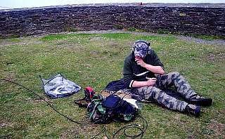 Ademas de las bandas de V y UHF también realizamos actividad en onda corta. El peso de la operación en los 40 mts estuvo íntegramente a cargo de EA1HBX con el FT-817 y su dipolo Bazooka, que ha demostrado un rendimiento muy bueno en actividades de este tipo. Como se trataba de activar la referencia SOTA (monte de Herbeira: EA1/CR-009), y para manterse fiel a este estilo de operación, no pudimos ayudarle con la instalación ni el transporte de la antena y equipo. Así que le dejamos un rincón sobre el prado, en donde no nos estorbase mucho, y allí tirado se ocupó el solito de hacer frente al pile-up.