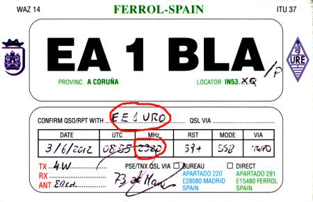 Salvo en la banda experimental de 70 MHz, en la que ni siquiera llegamos a escuchar las balizas de Orense o Portugal, logramos completar QSO en todas las bandas del concurso. Estrenándonos incluso en la banda de 2,3 GHz, en un ameno QSO con EA1BLA, durante el cual pudimos comprobar el correcto funcionamiento de la antena y el transverter de EA1DG.
