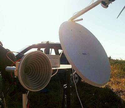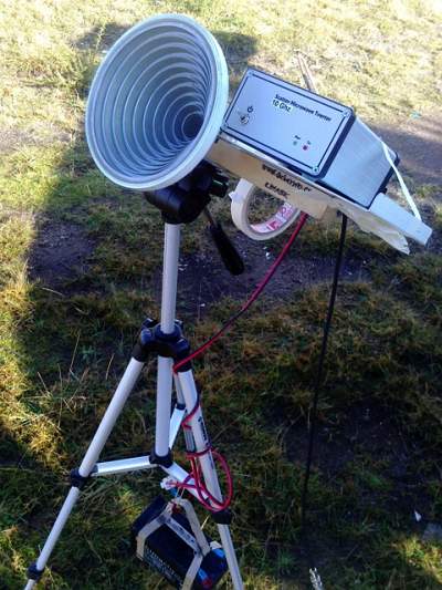 Alfredo ha realizado un estupendo trabajo amplificando la minúscula señal desde 432 a base de elementos recuperados de los LNB de TV. En esta ocasión usaba como elemento transmisor un "inseptum" y como receptor un LNB PLL montados lado a lado.