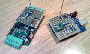 Ahora ya podemos montar nuestro prototipo, en el caso que se ve en las imágenes por comodidad para montar los componentes smd, la cara de soldadura esta encima, que son un módulo LPD 434 RFM12B, la fuente de alimentación de 3,3V y los circuitos de adaptación de niveles de tensión de 3,3V a los 5V que trabaja el resto de la circuitería.