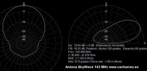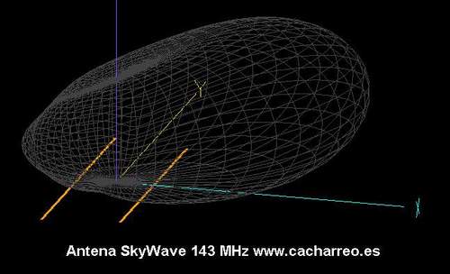 A 30º de elevación, la apertura de la SkyWave para una reducción de sensibilidad de -3 dB proporcona un horizonte de 75º. Las imágenes que se muestran proporcionan una indicación gráfica de los parámetros expuestos. La antena puede utilizarse a diferentes alturas, desde 0,5 a 1,5 metros, sobre el suelo para obtener diferentes angulos de ataque. cuanto mas baja la pongamos, mas alto apunta; cunato mas la elevamos, mas bajo apunta sobre el horizonte. Aunque con ello se alteran tamabién la limpieza de lóbulos y la relación F/B.
