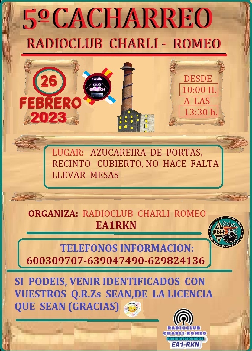 Un nuevo evento organizado por los amigos del Radio Club Charli-Romeo (EA1RKN) en la histórica azucarera de Portas. Nos vemos en Portas el Domingo 9 de Febrero ;-)